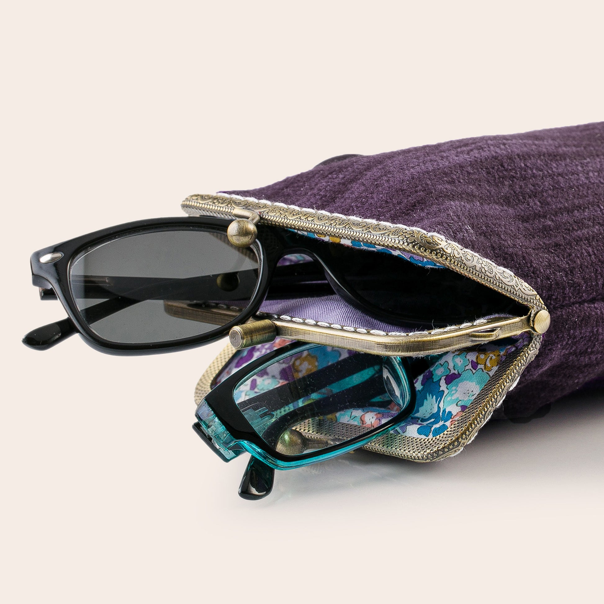 Combine your sunglasses and reading glasses elegantly in one case. Our fully lined and cushioned case is designed to accommodate chunkier sunglasses and reading glasses. With double pockets for flawless organization, each pocket can be opened and secured individually. Crafted from upholstery fabric with a delightful floral cotton interior, this case also includes a layer of padded cotton for added softness and superior protection.